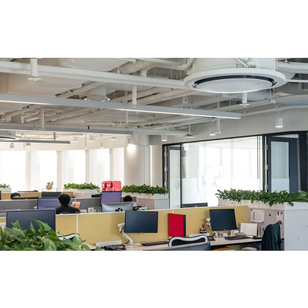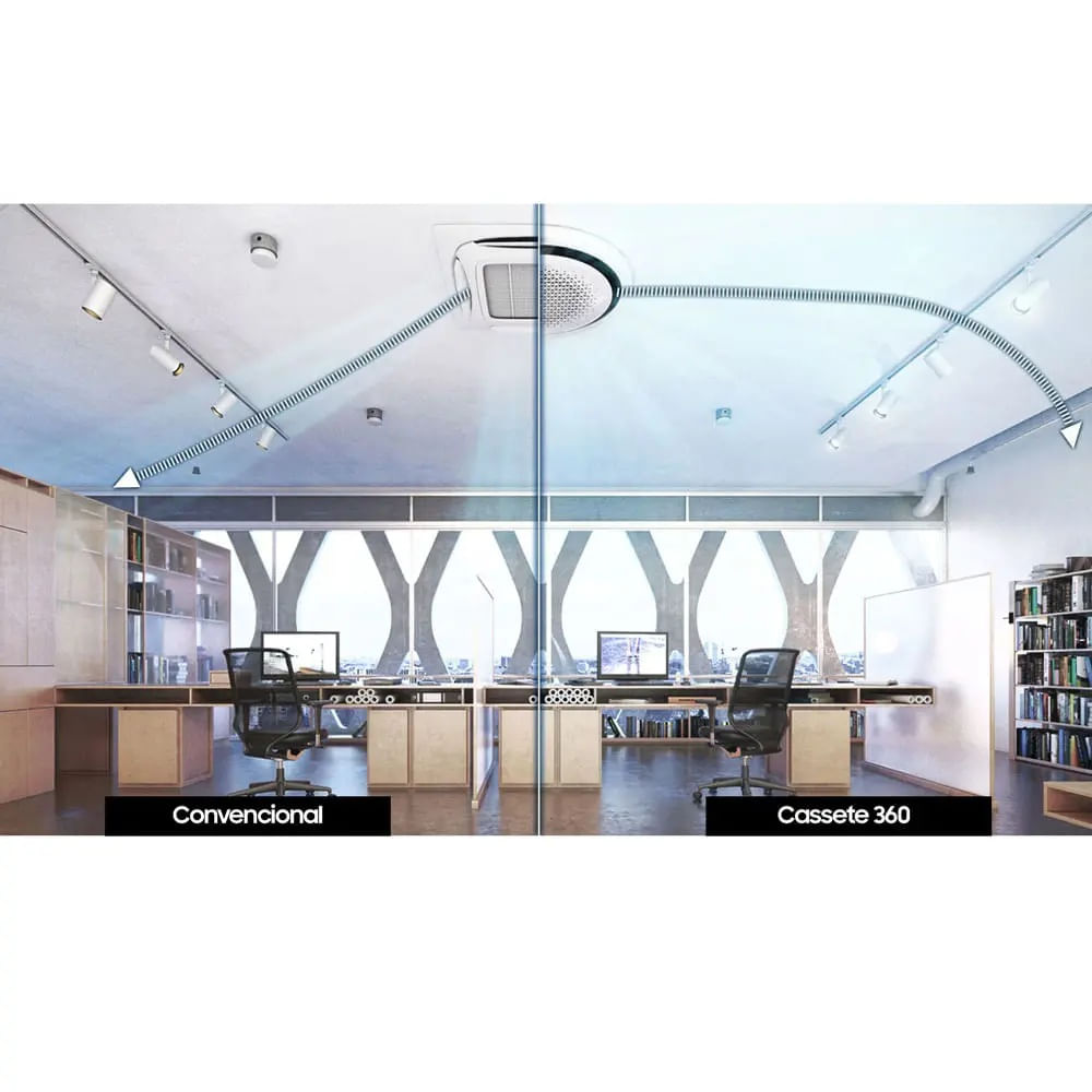 O Ar Condicionado Inverter Samsung WindFree Cassete 360 pode ser integrado a qualquer ambiente, pois seu projeto permite instalações com o aparelho embutido no entreforro em ambientes discretos ou instalações expostas para ambientes modernos e despojados.