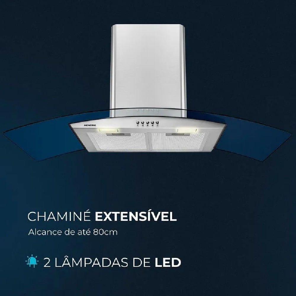 As 2 lâmpadas led deixam a área mais iluminada, facilitando a visualização na preparação dos alimentos. O aço inox proporciona mais durabilidade e a sua tela metálica filtrante e filtro de carvão ativado central facilitam a retirada para a limpeza e troca do filtro de carvão preservando a qualidade e a manutenção do seu aparelho. A CF90-01 possui chaminés extensíveis com alcance de até 80cm e suportes de instalação inclusos para você ficar despreocupado!
