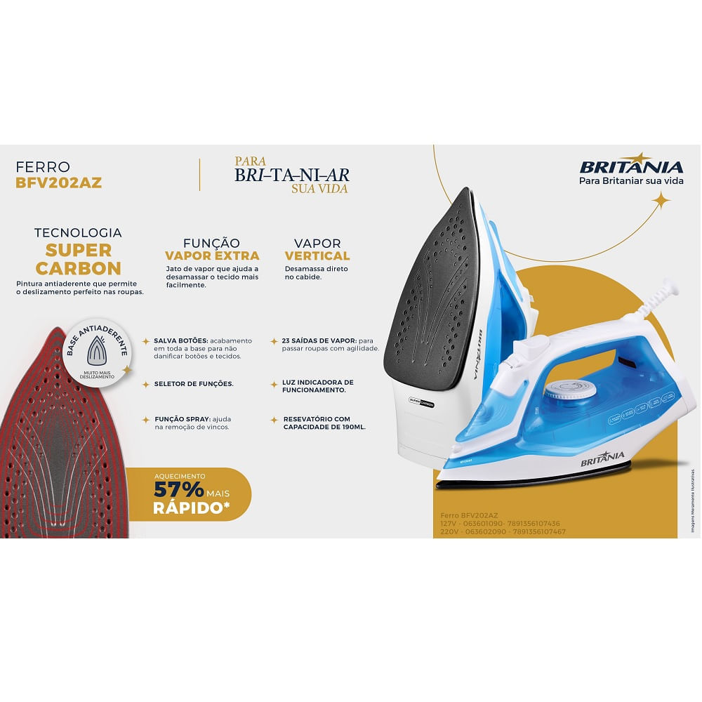 O Ferro de Passar a Vapor Britânia BFV202AZ possui a incrível tecnologia super carbon, que garante passar suas roupas com um deslizamento perfeito!