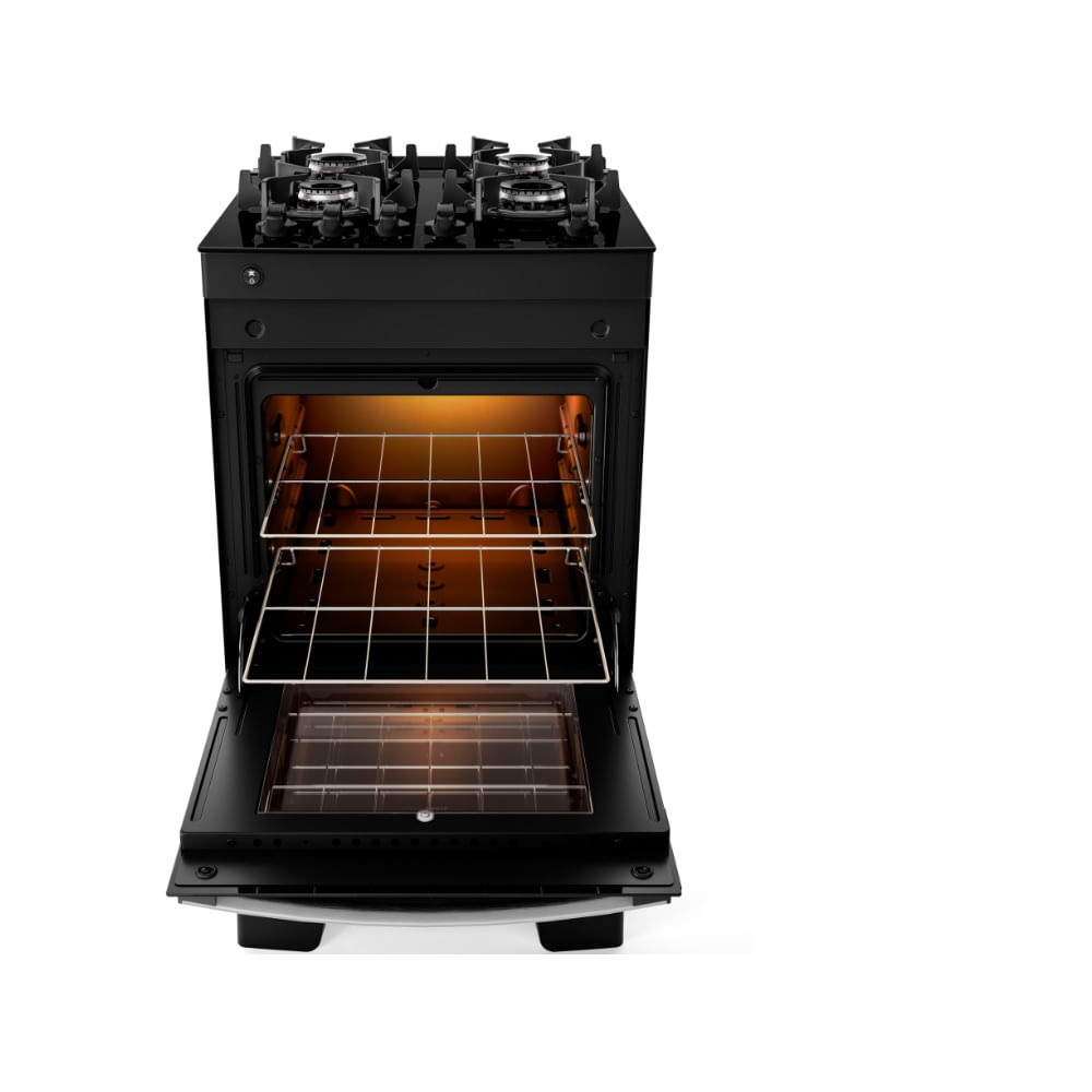 Mais estabilidade para as panelas,2 prateleiras deslizantes – Cabem receitas para toda a família, acompanha lâmpada de forno – Para acompanhar o ponto das receitas sem abrir a porta do forno, acendimento automático.