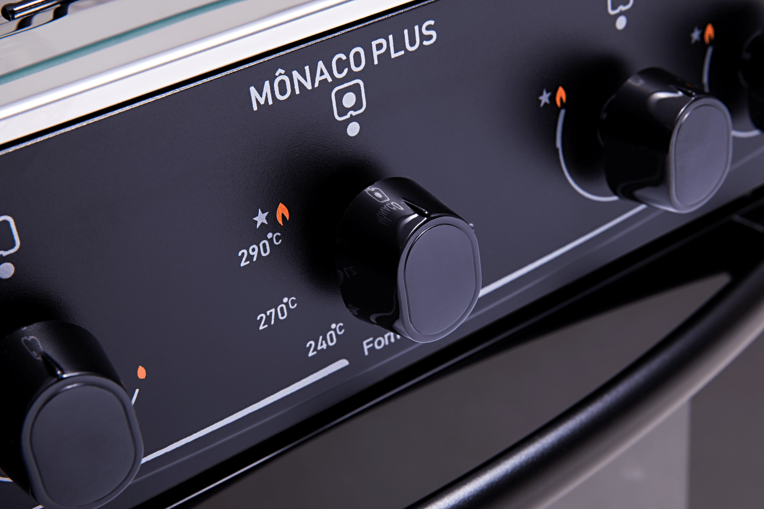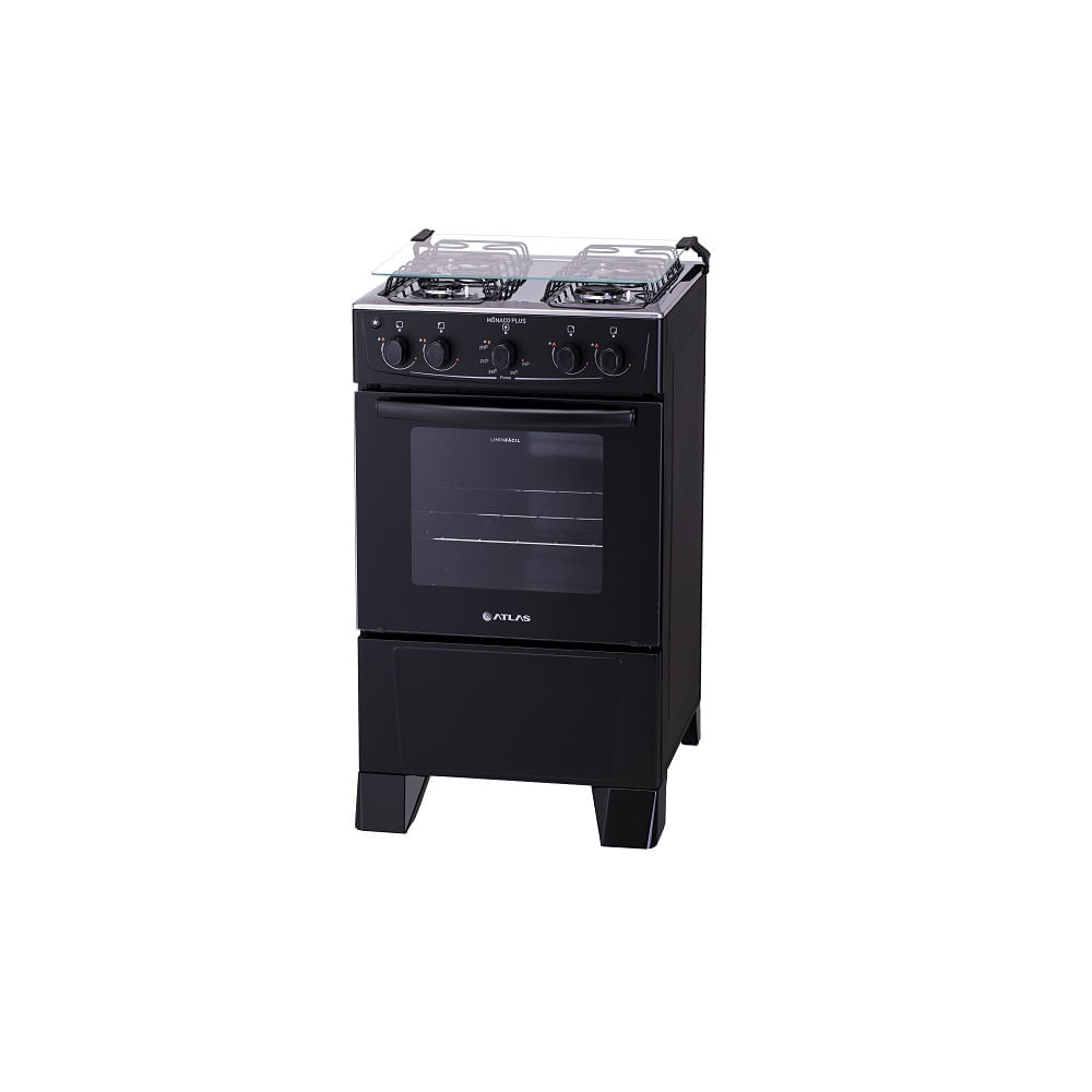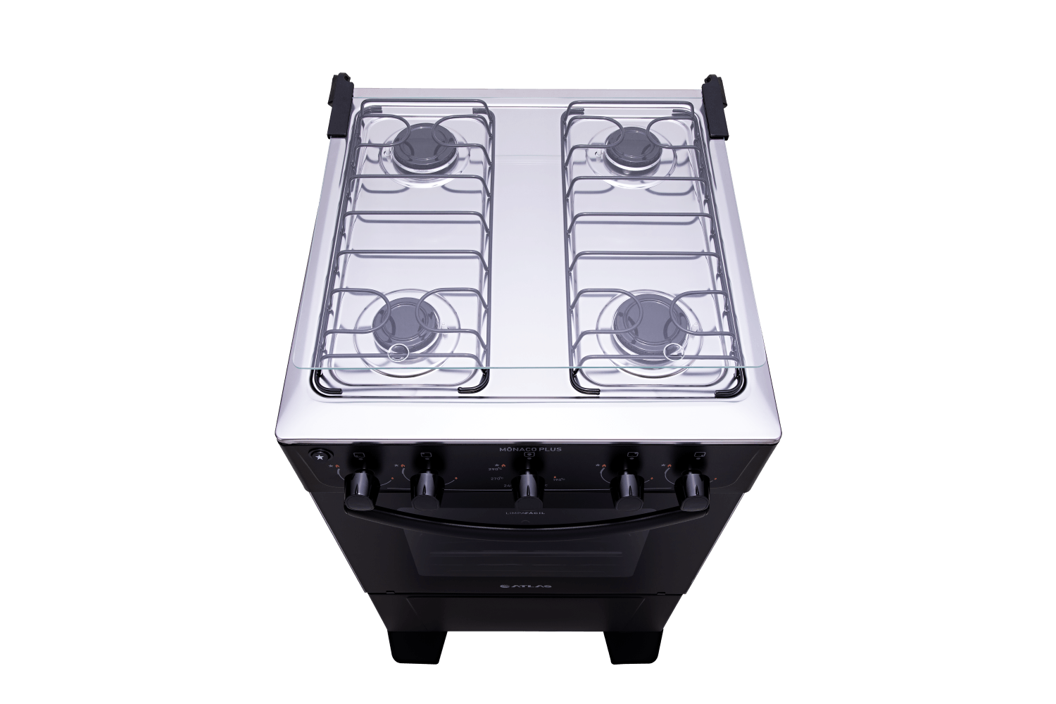 O Fogão De Piso Atlas Monaco Plus 4 Bocas Preto – Bivolt Possui mesa em inox, tampa de vidro na mesa, grades duplas de aço esmaltado, acendimento automático e botões removíveis que facilita na hora da limpeza.
