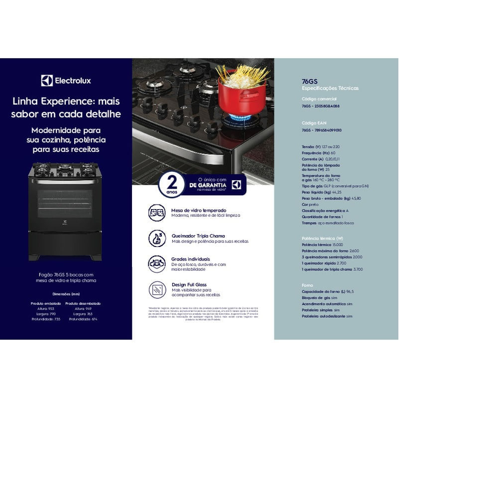 Fogão Electrolux 5 Bocas Automático com Mesa de Vidro Tripla Chama (76GS) – Bivolt