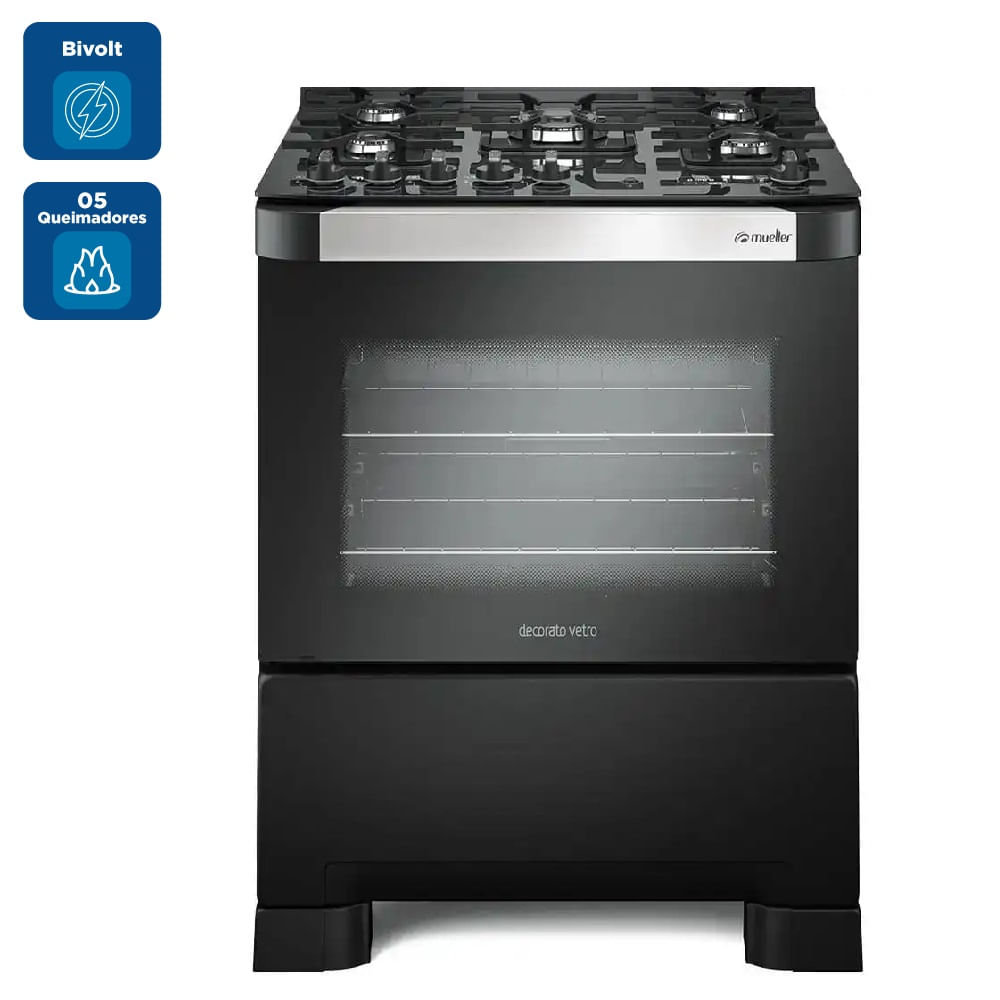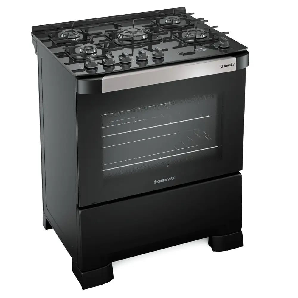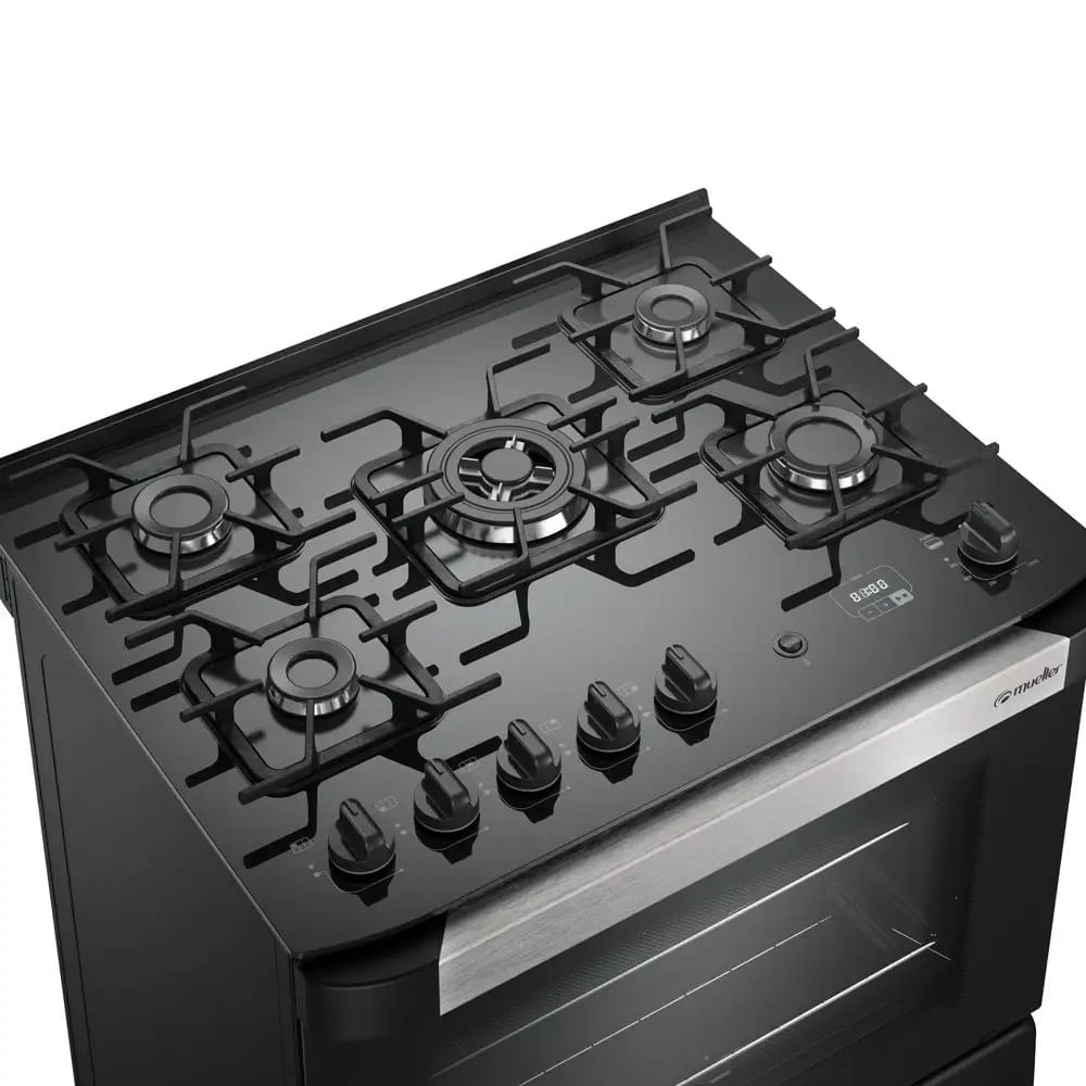 Fogão De Piso Mueller 5 Bocas Decorato Vetro Com Timer Preto Fosco – Bivolt