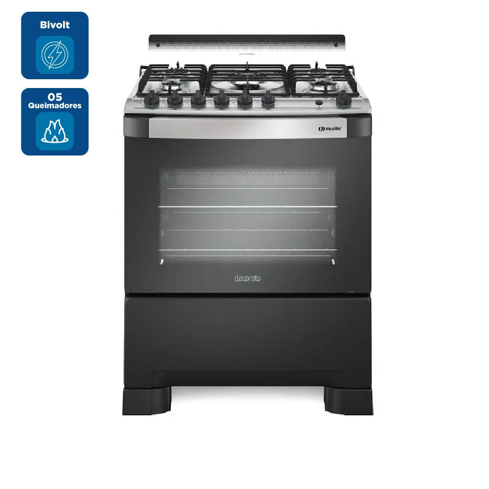 O Fogão de piso Mueller 5 bocas Preto Fosco Decorato Gourmet – Bivolt proporcionará eficiência e desempenho gourmet na sua cozinha Para quem aprecia uma receita bem executada, este é o fogão ideal.