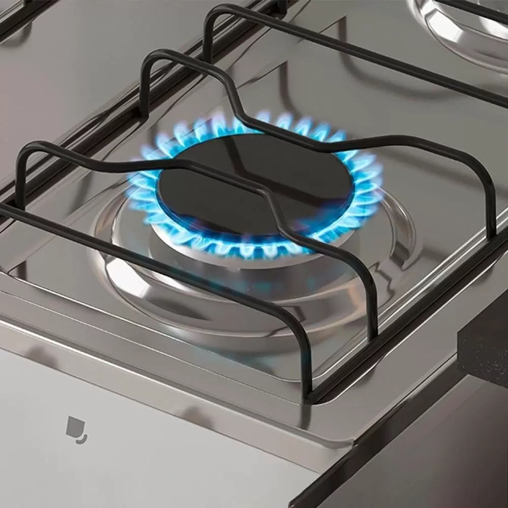 Seu puxador em aço proporciona abertura confortável da porta do forno, enquanto os manípulos resistentes com sinalização de posição garantem controle preciso da chama. Os queimadores em alumínio oferecem cozimento rápido e uniforme, tornando o preparo das receitas muito mais eficiente.