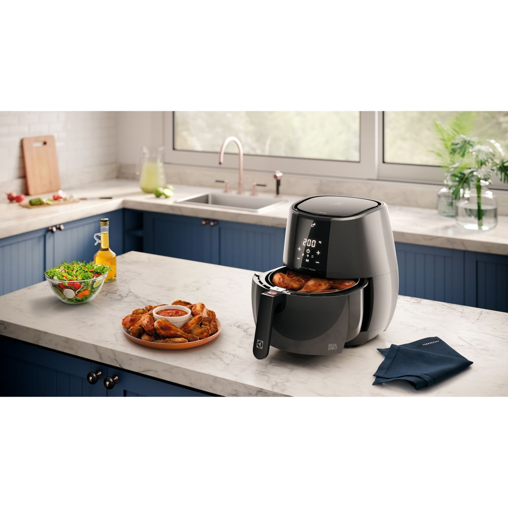 Air Fryer Electrolux EAF20 3,2 Litros Preta 127V é uma fritadeira elétrica ideal para quem busca preparar alimentos de forma prática e saudável. Indicada para famílias que desejam reduzir o consumo de gordura, ela resolve o problema da fritura tradicional, oferecendo pratos crocantes com até 90% menos óleo e quase 50% menos calorias.