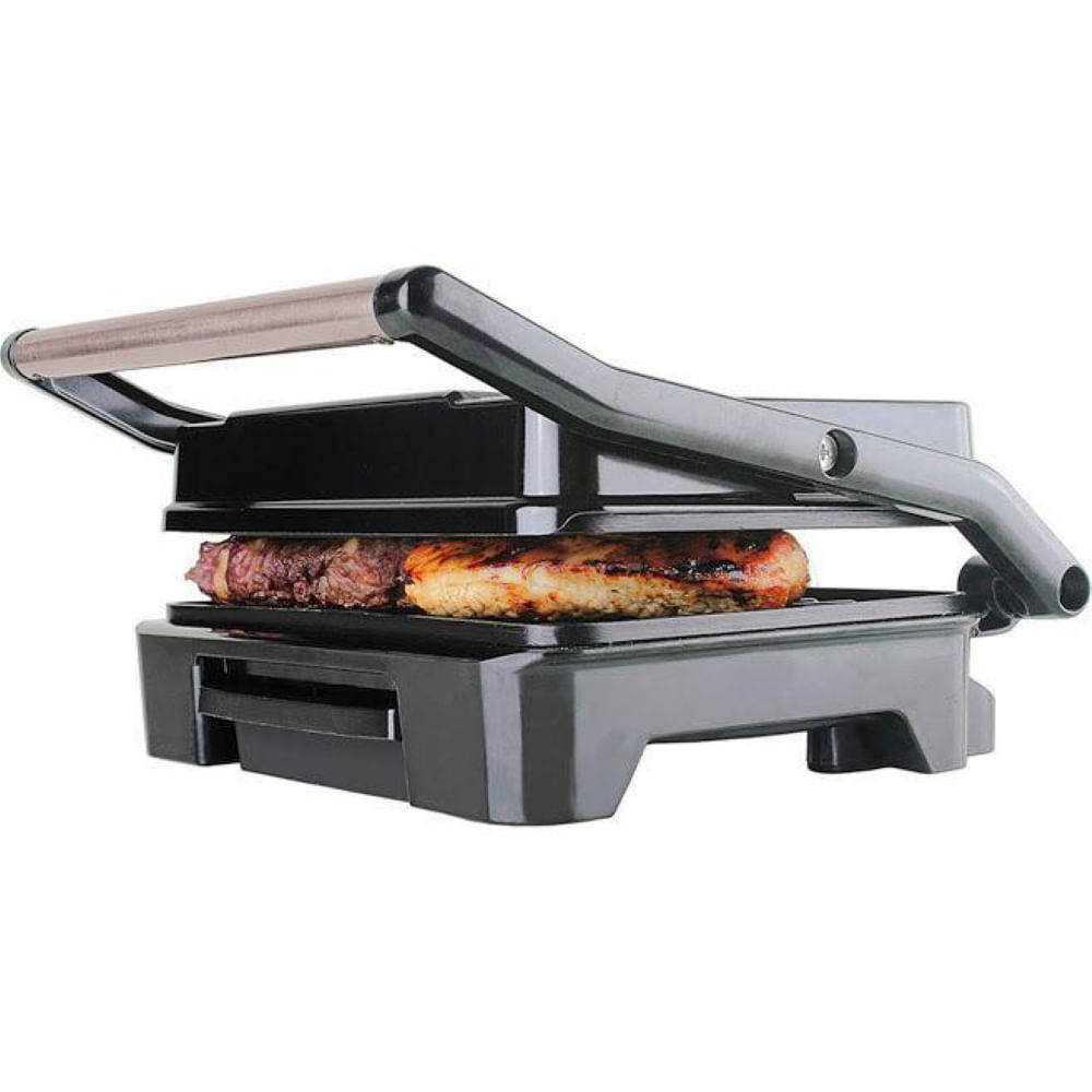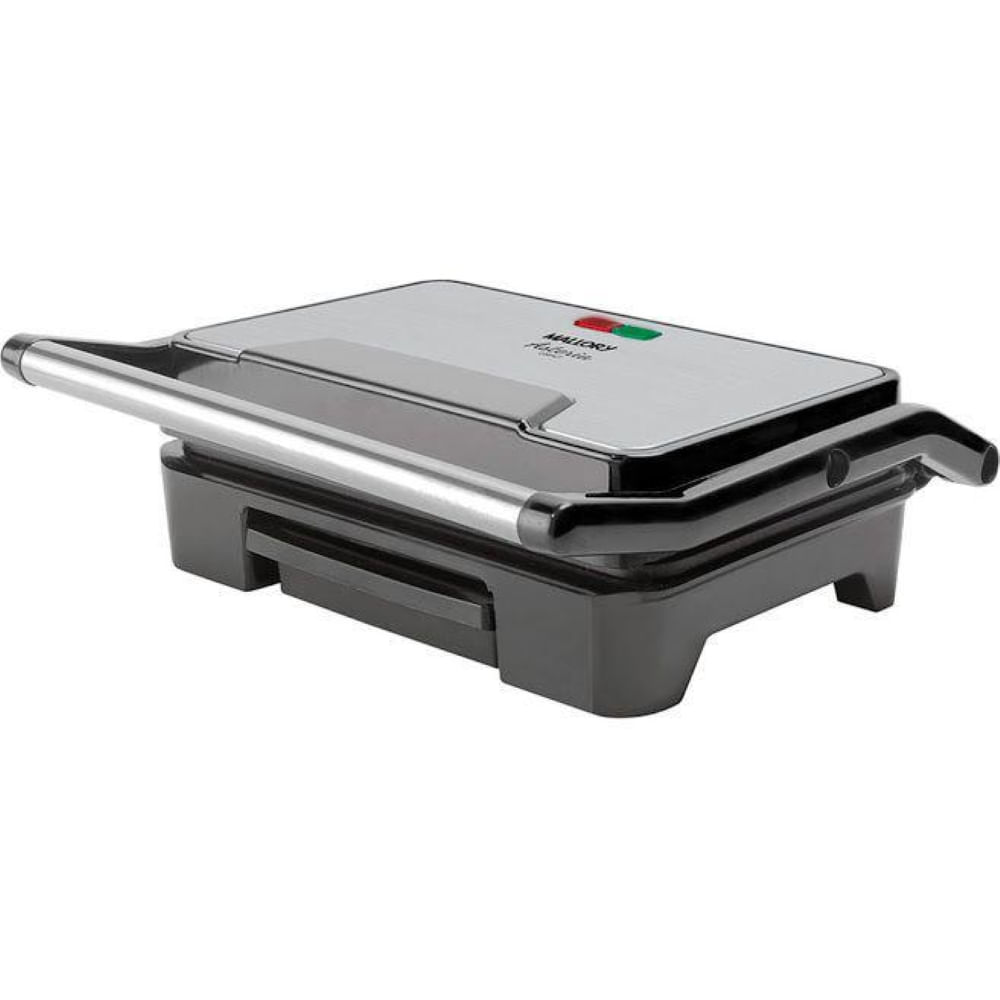 placas com grande superfície antiaderente, luzes indicadoras de funcionamento, coletor de gordura integrado e alça com toque frio.