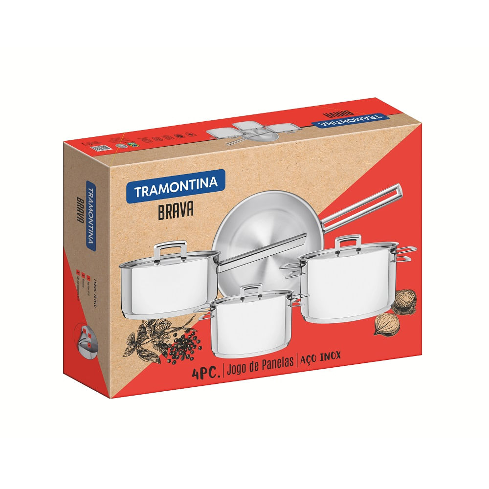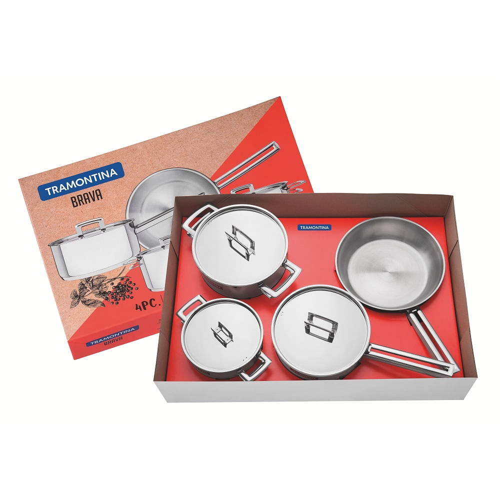Com o Jogo de Panelas Tramontina 4 Peças Brava em Aço Inox Fundo Triplo com Tampa Plana, a sua cozinha ganha praticidade e elegância. Com um toque moderno, as panelas podem ir ao forno para gratinar ou finalizar pratos, na temperatura máxima de 260° C. Além disso, são recomendadas para qualquer modelo de fogão e o seu fundo triplo (aço inox + alumínio + aço inox) ajuda a distribuir melhor o calor e permite economizar tempo e energia, mantendo a temperatura do alimento por mais tempo. O jogo de panelas da linha Brava é perfeito para a sua cozinha e para todas as suas receitas.