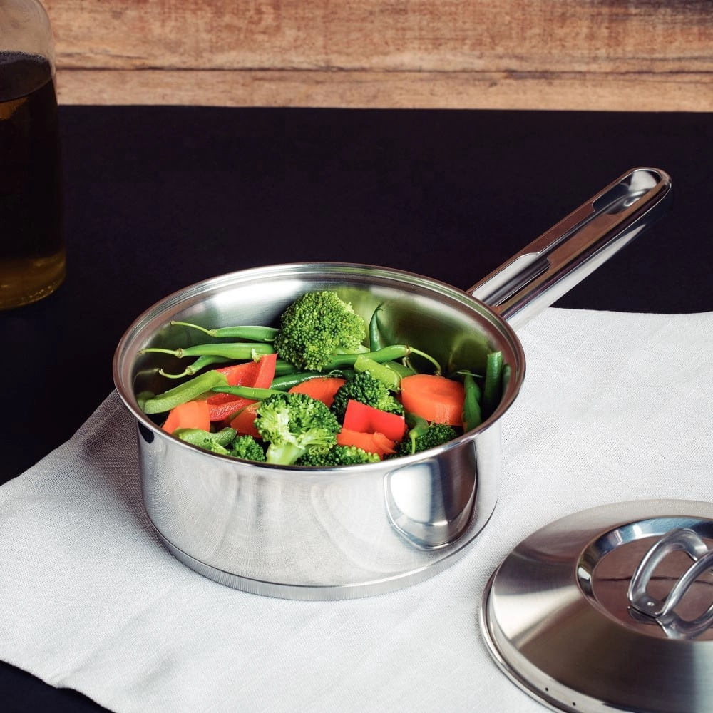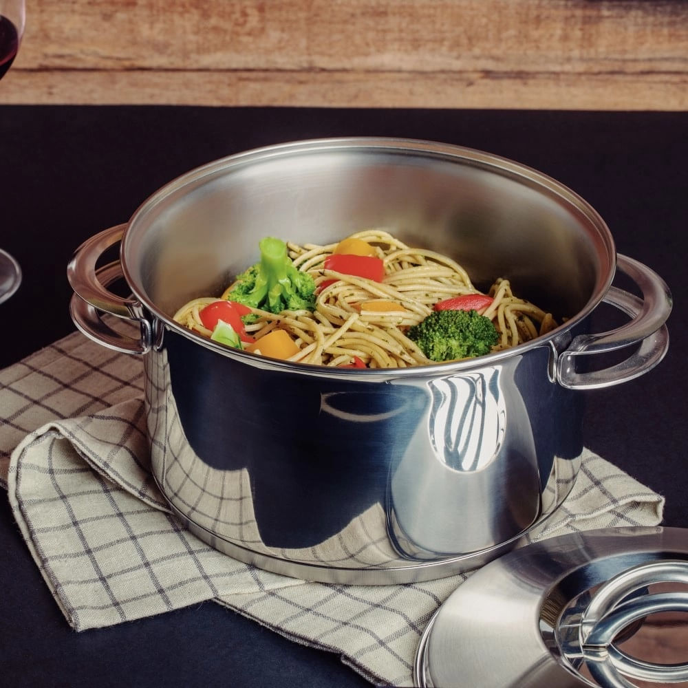 o segredo está no fundo triplo (aço inox + alumínio + aço inox), que distribui o calor uniformemente, proporcionando um cozimento mais rápido.