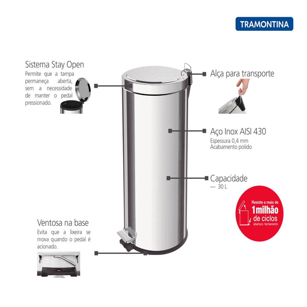 Tenha produtos que facilitem seu dia a dia. Com a Lixeira com Pedal Tramontina Brasil 30 Litros com Balde Interno Removível e Acabamento Inox Polido é um deles. Fabricada no Brasil, possui capacidade de 30 L é ideal para as atividades diárias. Produzida em aço inox com acabamento polido e tampa com ressalto, garante maior resistência. A abertura por meio de pedal, aguenta mais de 1 milhão de ciclos (abertura e fechamento) e por meio do sistema Stay Open, abrindo a lixeira manualmente, ela se mantém na posição aberta, facilitando o depósito de resíduos. Possui balde interno removível, alça para transporte e ventosa na base que evita o movimento do produto no manuseio. Um produto essencial para uso diário.