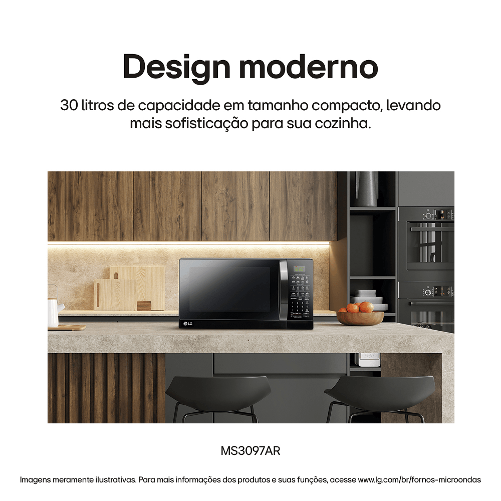 Além de tecnologia e capacidade de 30L, o micro-ondas LG possui um design diferenciado, capaz de transformar a sua cozinha em um ambiente sofisticado. Sua frente espelhada dará um toque especial na decoração da sua casa.