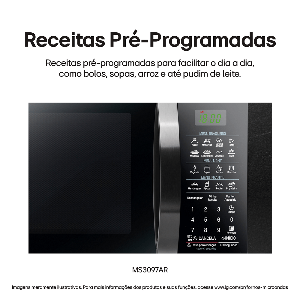 Mais opções de cozimento com o micro-ondas LG, elaboradas para atender à todos os gostos e garantir mais praticidade no seu dia a dia: Menu Brasileiro (9), Menu Light (4), Menu Infantil (4).