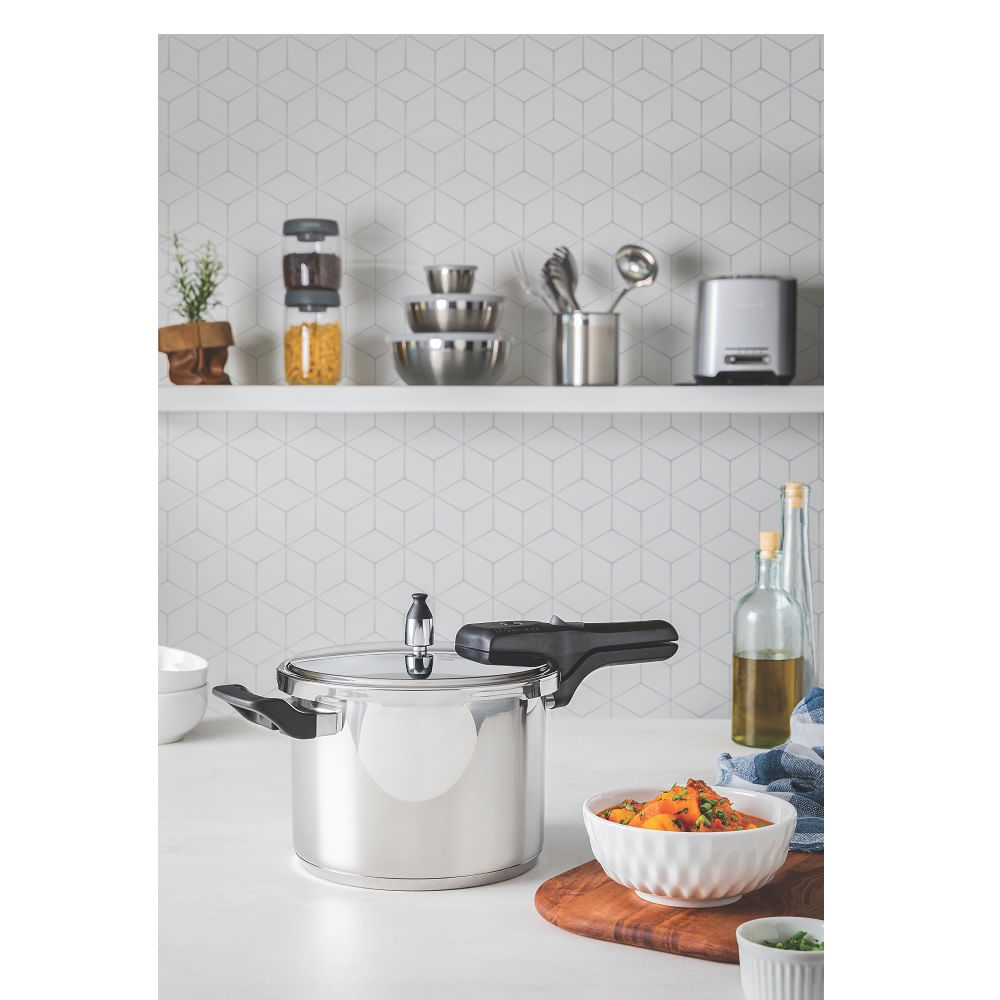 Com cabo e alça antitérmicos, a segurança e facilidade de manuseio são prioridades. O fundo triplo, composto por aço inox, alumínio e novamente aço inox, distribui o calor de maneira uniforme, acelerando o cozimento e economizando energia, enquanto mantém os alimentos aquecidos por mais tempo. Com sistema de descompressão e medidor de capacidade interno, o controle preciso das porções é mais fácil do que nunca. Descubra o padrão de qualidade e eficiência que só os produtos Tramontina oferecem para aprimorar sua rotina na cozinha!
