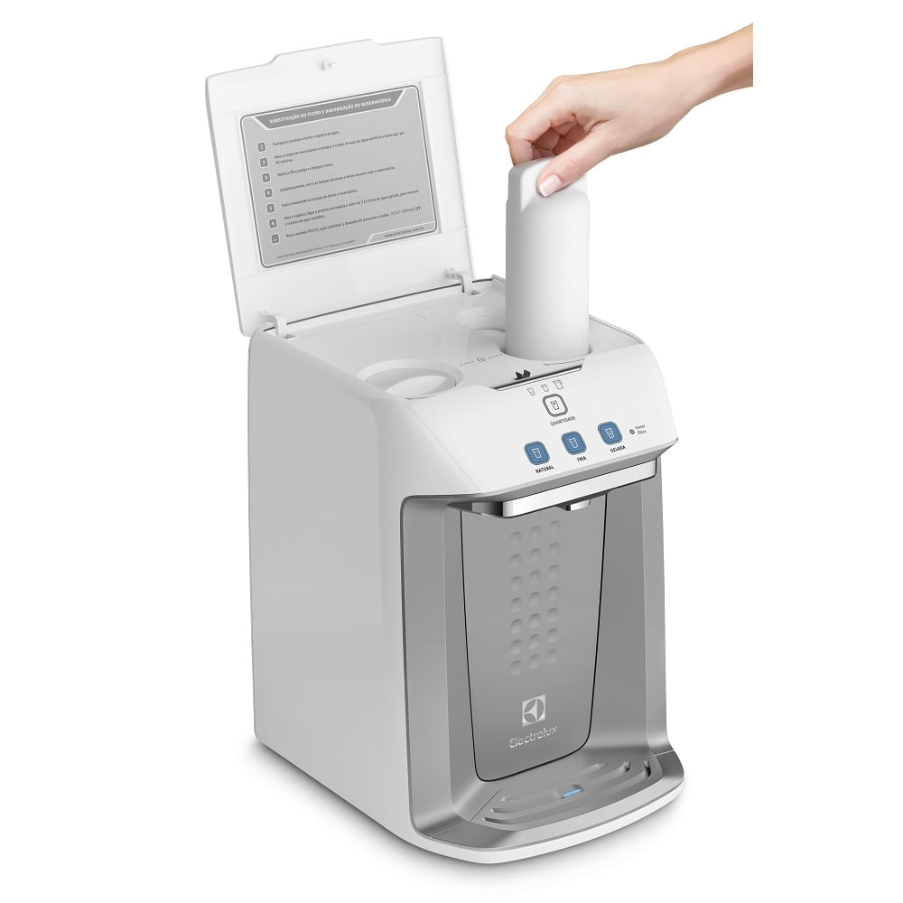 O Purificador de Água possibilita a escolha entre três temperaturas: fria, gelada ou natural. Ainda é possível decidir sobre a quantidade de água entre 100 ml, 300 ml ou 1 litro. Ou seja, com o Purificador de Água Electrolux, não é preciso ficar segurando o botão do aparelho para encher uma garrafa. Tudo graças a seu fluxo contínuo de água.
