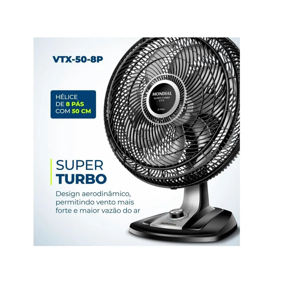 O ventilador de mesa Super Turbo VTX-50-8P possui 50 cm de diâmetro e hélice de 8 pás promove uma circulação de ar mais eficiente e garante mais frescor ao ambiente. O sistema de ventilação alia a potência para refrescar ao baixo nível de ruído, proporcionando o silêncio necessário para momentos de concentração e uma excelente noite de sono.
